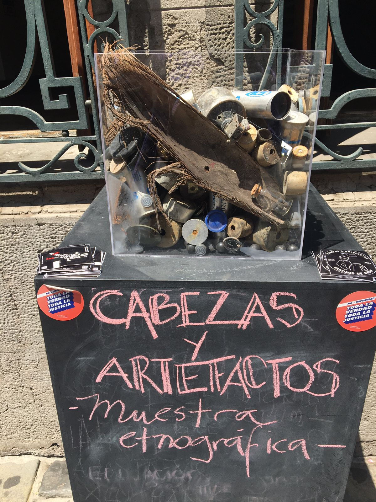 Desde el 28 de octubre y hasta el 25 de noviembre, el fruto de la observación y curatoría etnográfica de Rodrigo, se exhibe en Londres 38, espacio de memorias, bajo el nombre de "Cabezas & Artefactos", un recorrido dialogado por los objetos, fotografías, relatos y registros, reunidos entre octubre de 2019 y julio de 2021, en los alrededores de Plaza de la Dignidad.