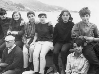 Fotografía de Alfonso Chanfreau junto a sus compañeros/as del quinto año de humanidades del Liceo Gabriela MIstral, durante su gira de estudios al sur de Chile, realizado entre los meses de noviembre y diciembre de 1966. En la imagen, el grupo de estudiantes espera la llegada de lanchas en Pargua, localidad ubicada en la actual comuna de Calbuco, Puerto Montt, para realizar el cruce a la isla de Chiloé. De pie, a la derecha de la fotografía, Alfonso. Al costado izquierdo de pie con boina, su profesor jefe Edmundo de la Parra.