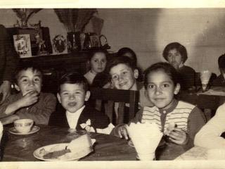 Fotografía de la celebración de la primera comunión de Gregorio Gaete junto a su familia y amigos/as. El niño del centro, con traje negro, sonriendo, es Gregorio.